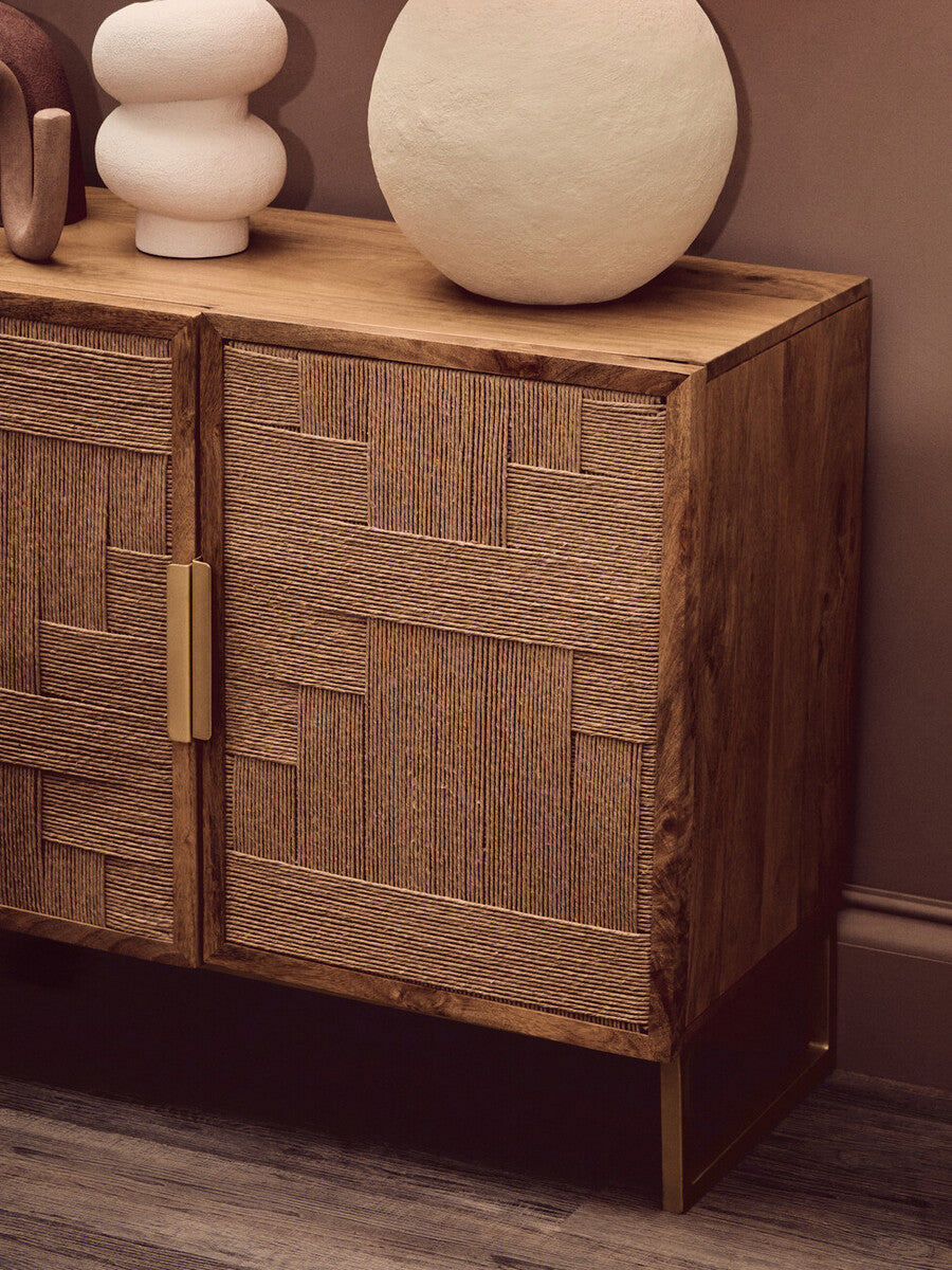 Place the Carta Natural Papier Mache Table Lamp With Rust Raffia Shade on a sideboard with a round mirror above for a welcoming focal point. On a desk, it softens the look of metal and glass while providing gentle task lighting. Pair with terracotta pots or caramel-toned cushions to echo the shade and complete a cohesive palette.