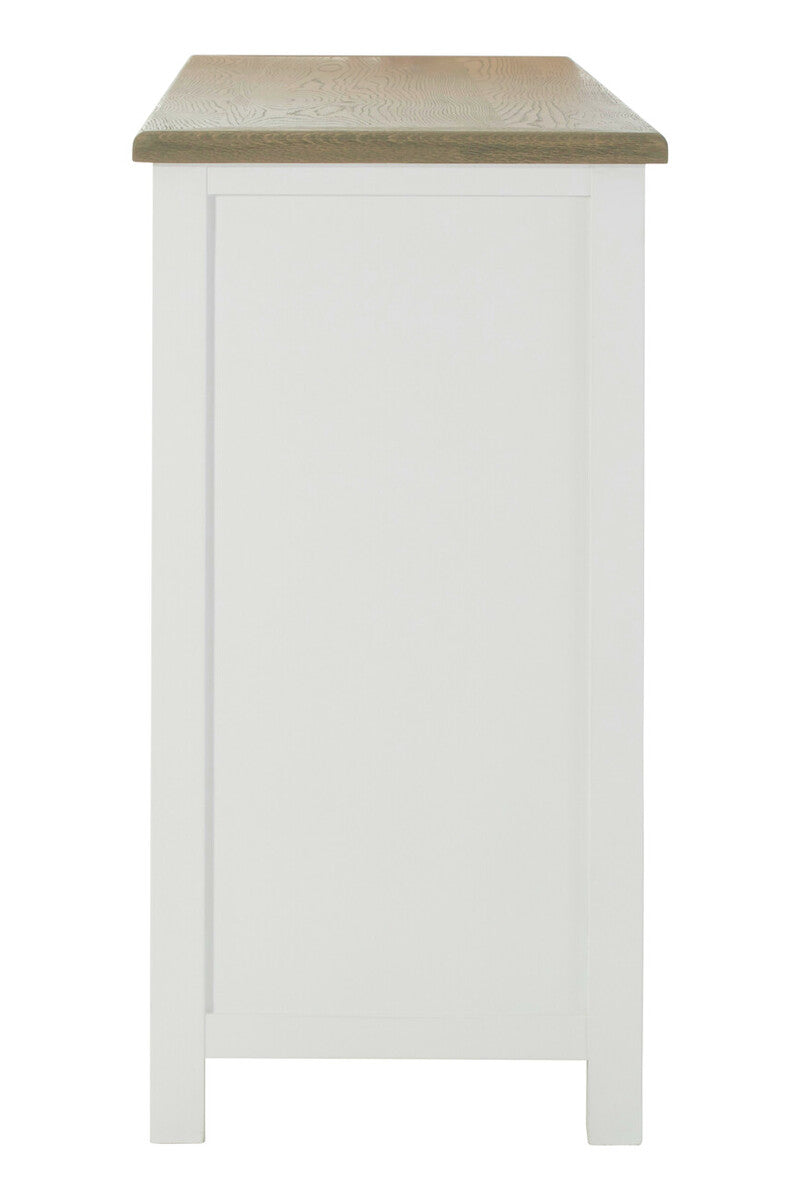 Featuring four drawers and four cupboard doors, this sideboard pairs a crisp white body with a warm oak top, bringing both brightness and natural warmth to your space. Carved metal handles add classic detailing while providing a comfortable grip for daily use.